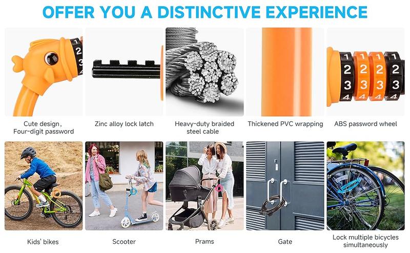 1. Safe and Durable Multi-functional Lock: The fish-head lock features a high-strength braided steel cable on the inner layer and is covered with thickened waterproof PVC material on the outside. Its lock core is made of zinc alloy and the code wheels are made of ABS material. It has strong anti-cutting performance. The PVC coating not only enhances its durability but also prevents scratches on bicycles, making cycling noise-free. With a length of 3.9 feet and a retractable design, it is suitable for numerous items such as bicycles, scooters, gates, baby carriages, lawn mowers and so on.